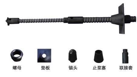锚杆分为自进式注浆工艺技术,其结构组成则是由止浆塞、自进式钻头、螺母、连接套、垫板,还有最重要的一个是中空锚杆体。其中需要用的零件是钎尾式的连接套可以用来与手风钻相连,还有帮助注浆的接头。在那种岩层中可以保持长久支撑,不被破坏。它的外观很特别,中间空心结构,外部形成一种波纹型螺纹并凹凸不整。垫板结合螺母是对岩层的支撑能力起到更有效的结果。并将钻头安放在锚杆上,连接套便于锚杆体的长度增加和钻进